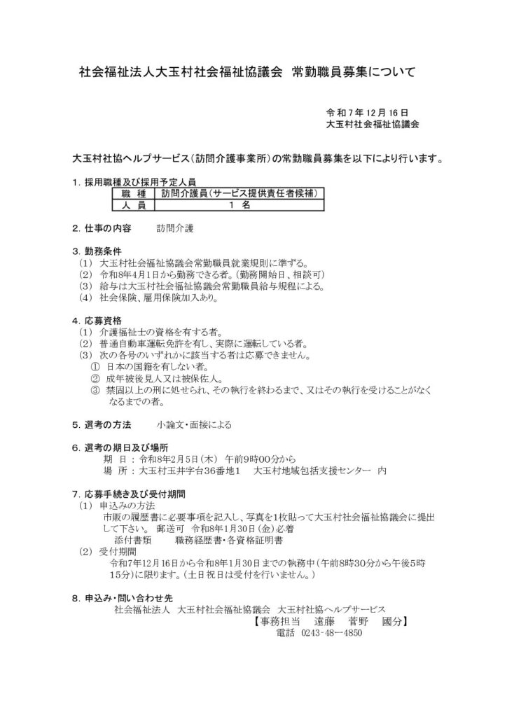 トップ お知らせ一覧 大玉村社会福祉協議会常勤職員募集