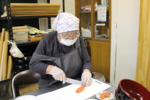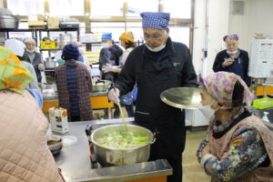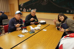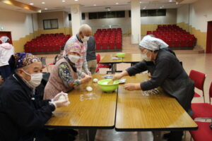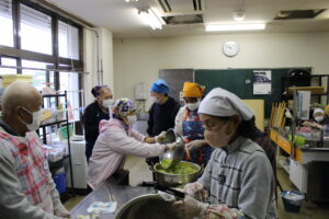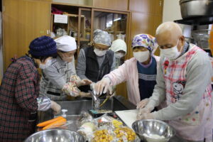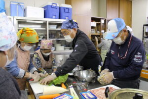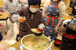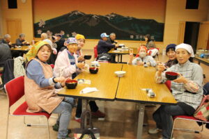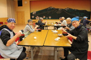 今回は2月のサロンで作った味噌を使い、具材たっぷり芋煮汁、きのこ汁を班に分かれて全員で作りました。男性だって、オレに任せて!と包丁片手に腕の見せ所(^^♪