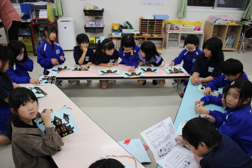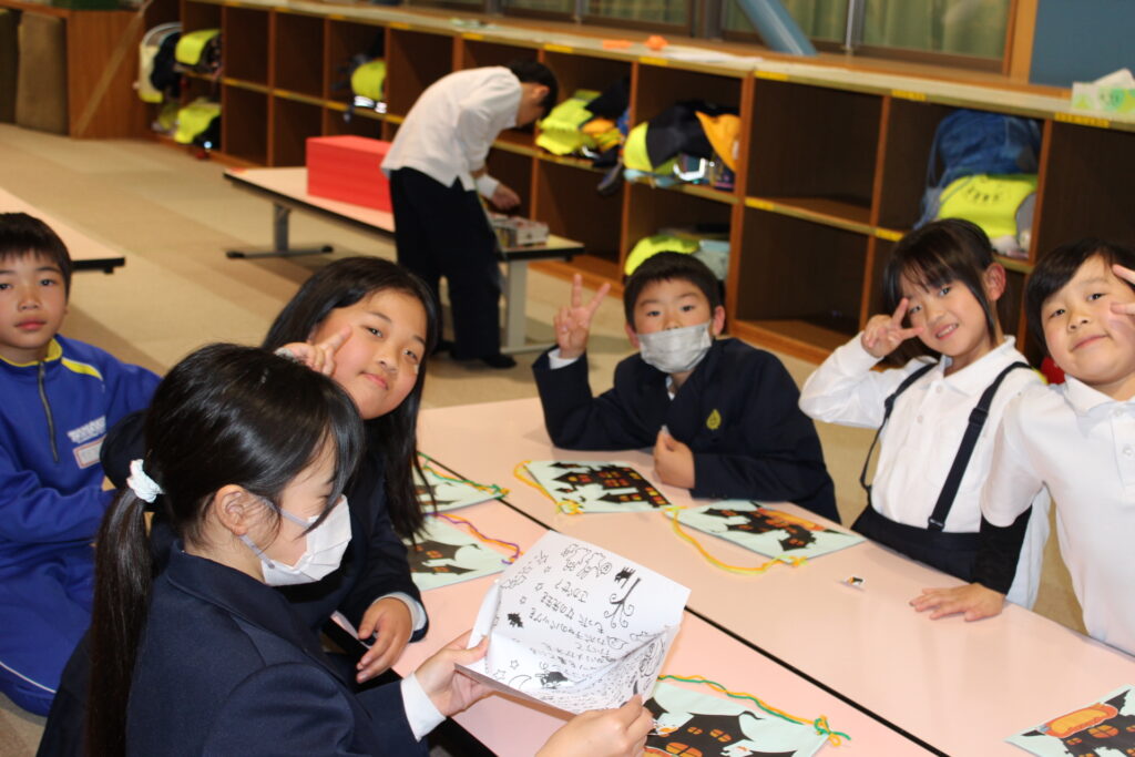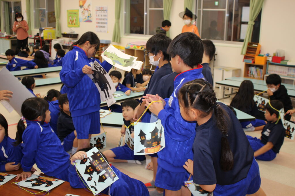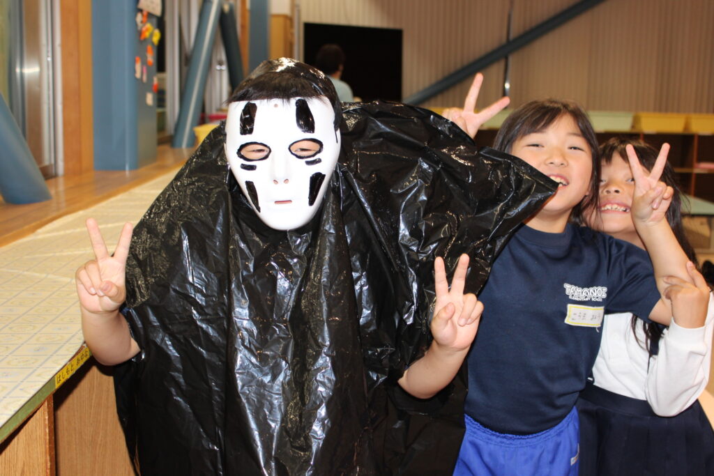 高学年と低学年が一緒のチームになって、〔青色のTシャツに鼻眼鏡をしている先生を探せ〕や〔ぐるぐる巻きになっているモンスターはなんだ?〕などの問題を解きながらクラブの先生(⁉)たちからお菓子をもらいました。仮装した先生たちに「カオナシだ!!」「あの先生なにか持っている!」など大きな歓声が上がっていました。