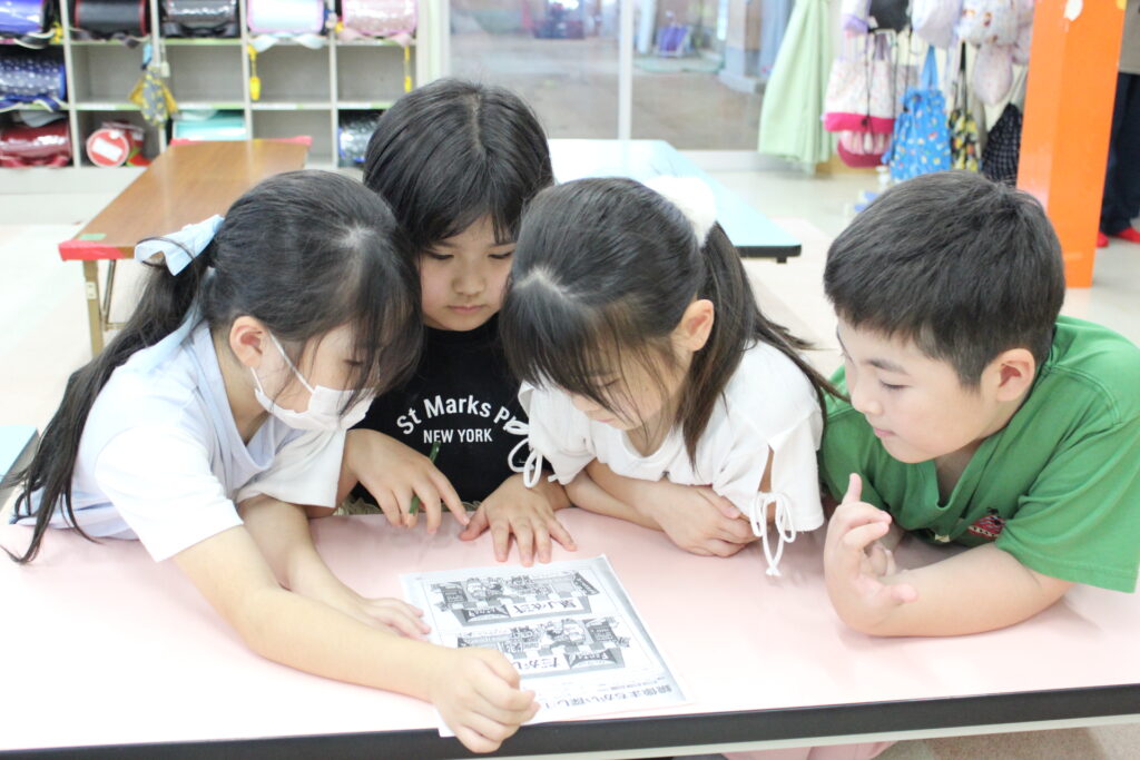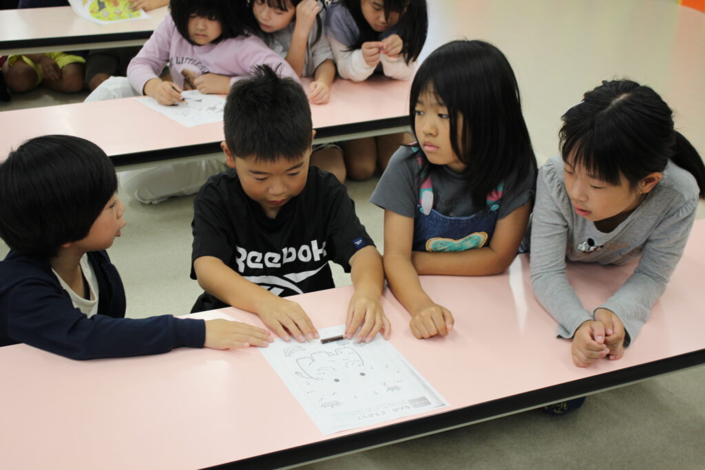 絵探しや迷路は、班ごとにプリントの問題を見て「これかな?」「みつけた!」など話し合いながら行っていました。