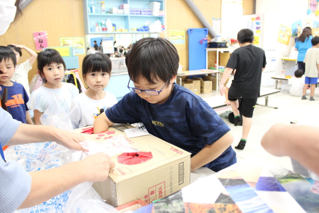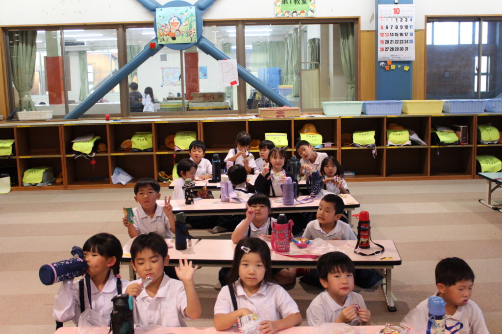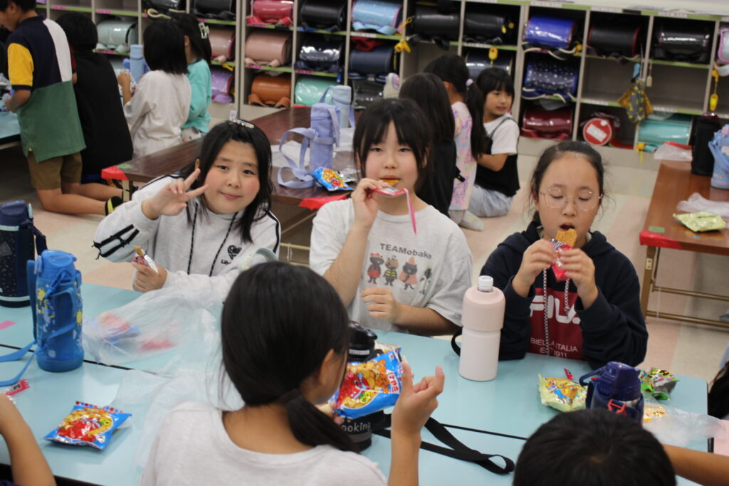 おやつは、ゲームの景品で貰えたいろいろな駄菓子でした。「これ好きなおやつ!」や「お祭りまたやらないかな?」という多くの声が聞こえました。