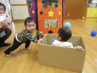 保育士の真似をして、箱の中のお友だちの事を一生懸命押してます!『よいしょ!よいしょ!』一緒に遊んで楽しそうですね☆