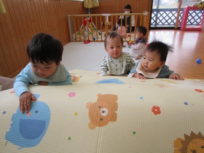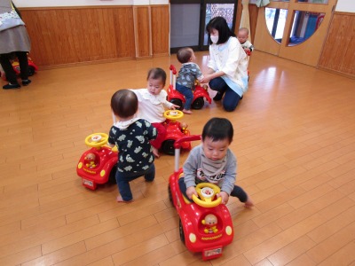 ↓歩けるようになったお友だちが増え、コンビカーに乗ったり、押したり、好きな所へ移動を楽しんでいます。