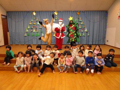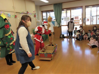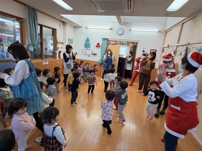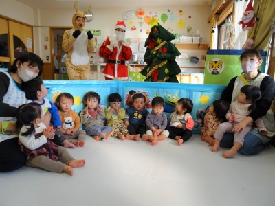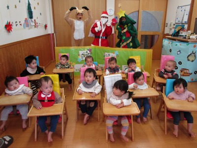 こねこ組・りす組の子どもたちは、お誕生会を兼ねてお遊戯室で、ひよこ組の子どもたちは、それぞれの保育室で楽しいクリスマスのお祝いをしました。